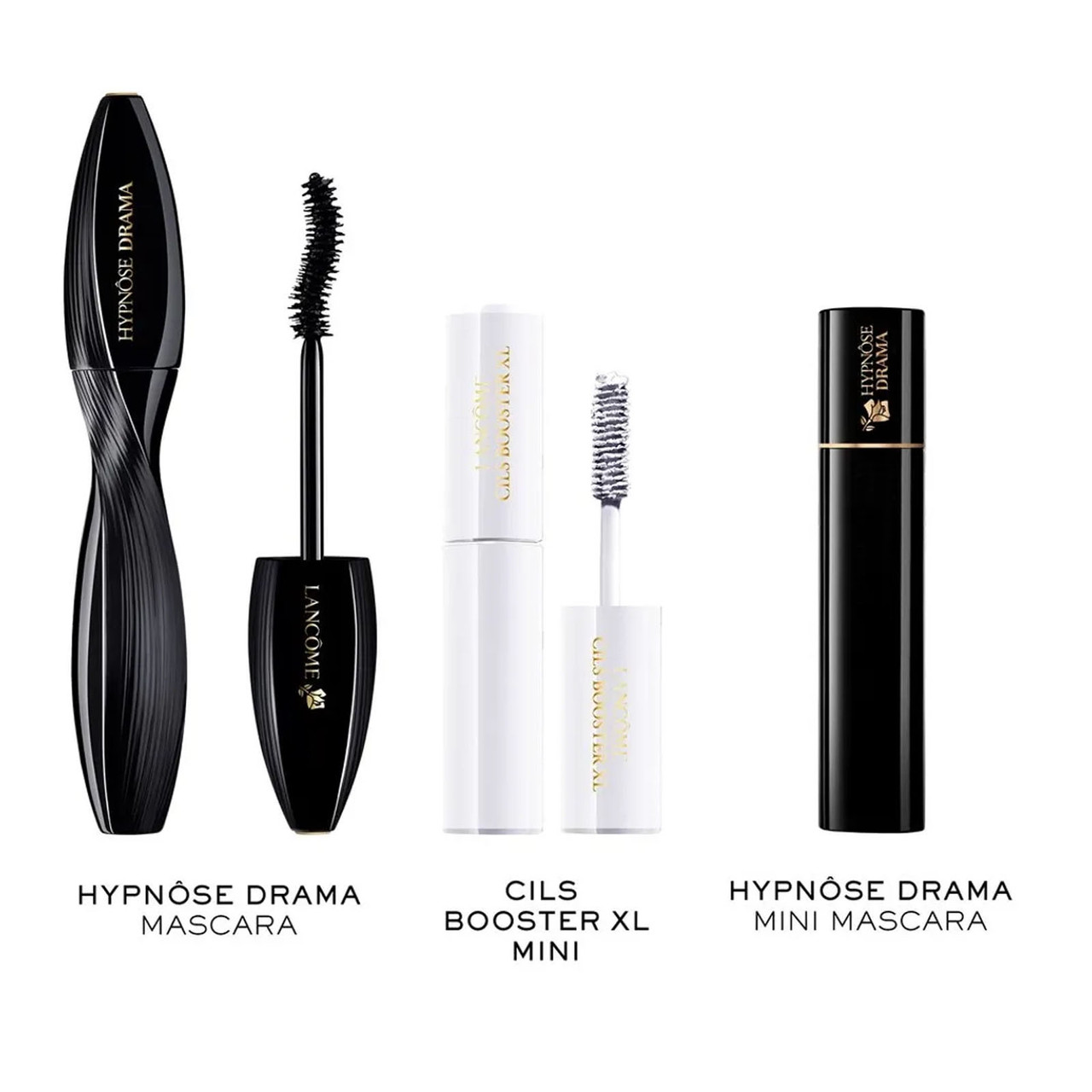 Con il Set Hypnôse Drama Mascara di Lancôme è possibile creare un look occhi intensamente drammatico. Questo lussuoso set contiene il mascara Hypnôse Drama in Excessive Black, la versione da viaggio e il primer Cils Booster XL. La formula costruibile, arricchita con un complesso legante al 2%, fornisce un volume fino a 17 volte superiore e una tenuta di 24 ore, condizionando e rinforzando le ciglia. Lo scovolino a forma di S avvolge ogni ciglia e le riveste dalla radice alla punta per una pienezza istantanea e un'intensità spettacolare. Il Primer Cils Booster XL crea una base liscia e aumenta il volume del mascara fino a 21 volte.