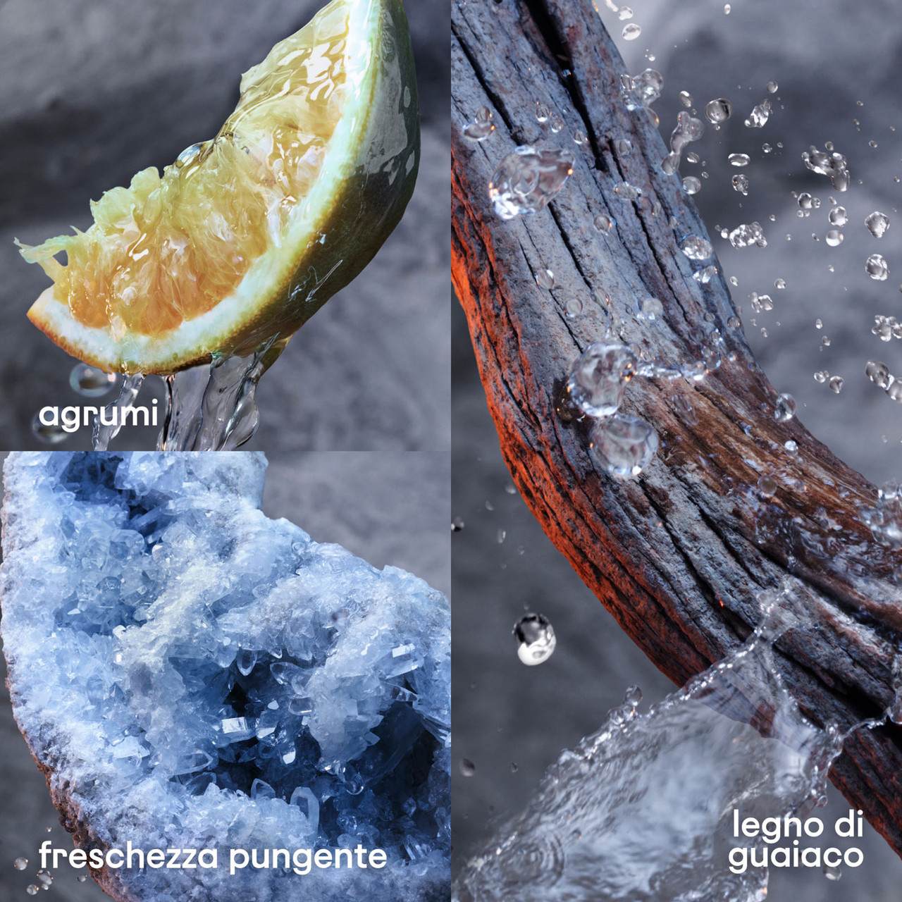 Uno shock olfattivo in cui due forze si scontrano. Freschezza pungente: accordo marino, corteccia di pompelmo, foglia